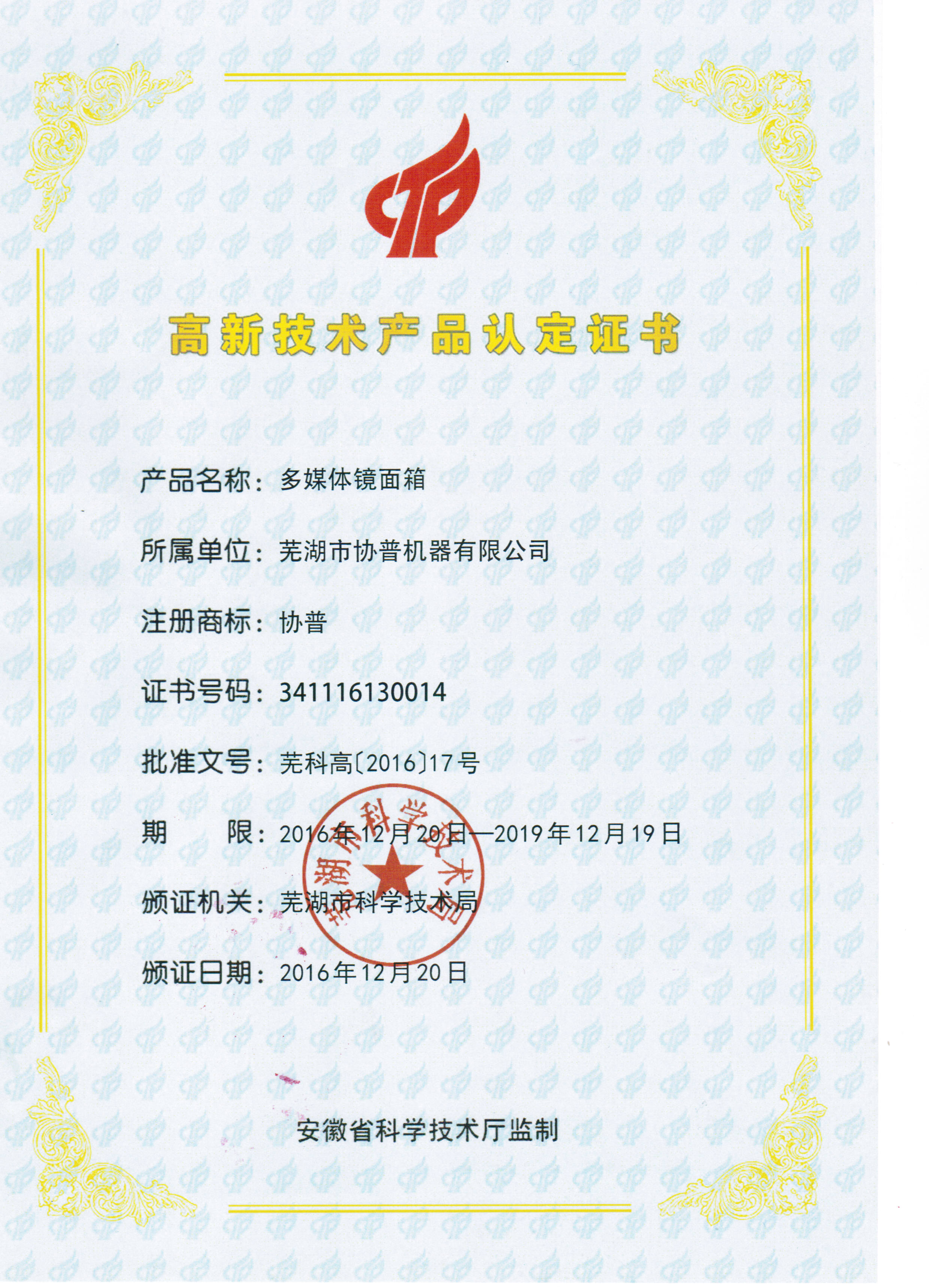 2016年9月,為提高產(chǎn)品知名度,我公司將一款新型高技術(shù)產(chǎn)品申報(bào)安徽省高新技術(shù)產(chǎn)品,經(jīng)安徽省科技廳專家評審,于2016年12月正式通過審核。