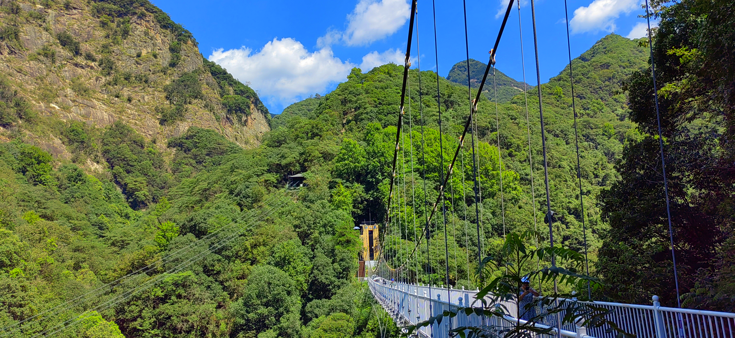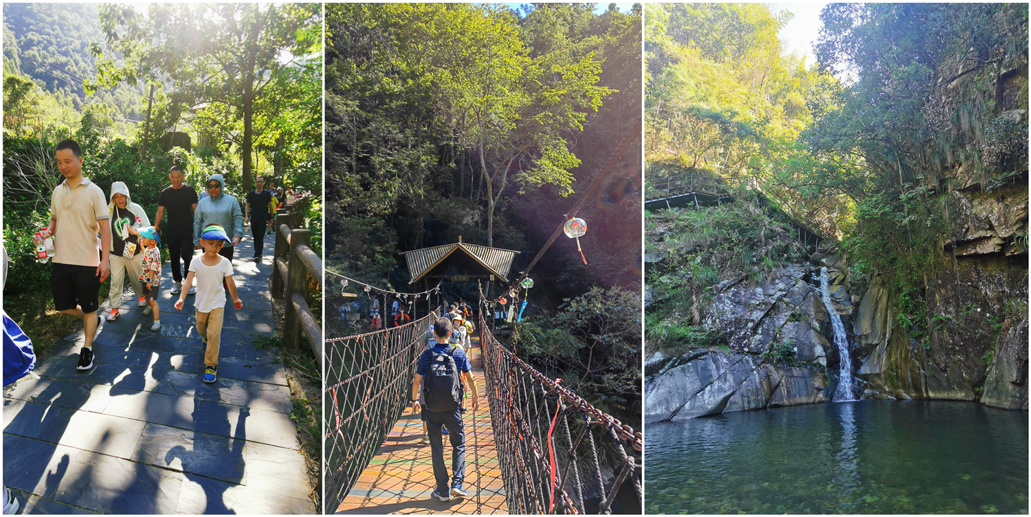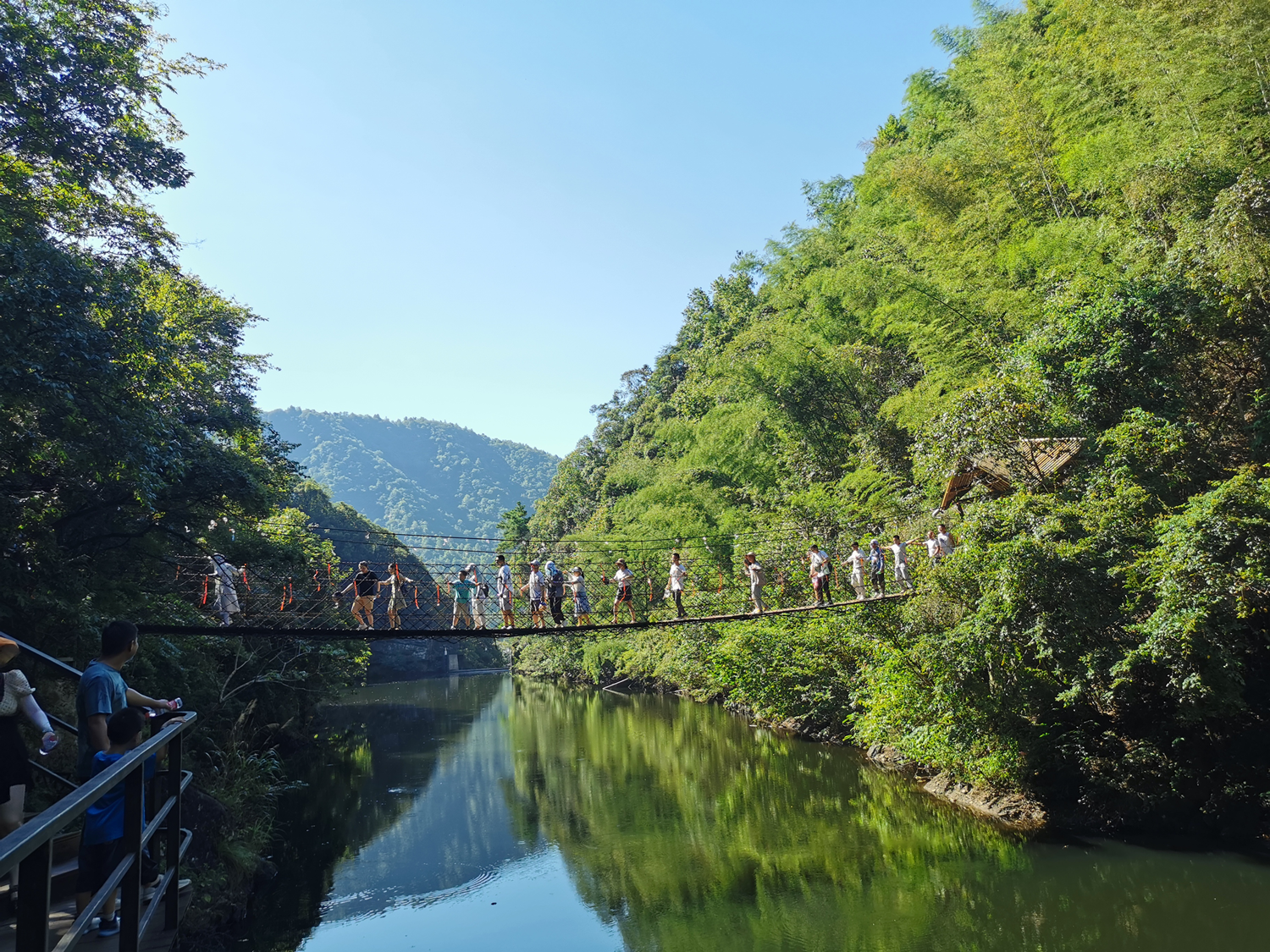 晚上體驗了農(nóng)家樂菜肴和當(dāng)?shù)靥厣袼藓?,第二天早早的起床,吃完早餐集合,大家興致勃勃地乘著大巴來到了醉山野景區(qū),這里是安徽省內(nèi)第一個5D玻璃橋皖南地區(qū)最大的瀑布群。在進入景區(qū)之前,有一段鄉(xiāng)村道路,徒步的過程頂著早上八九點的太陽就覺得酷暑難耐,然而當(dāng)我們正式踏入景點,走在山谷間的步棧道上,遠處是蔥郁的山林、近處是流動的溪水、頂上是一片陰涼,只聽見大朋友們小朋友們都在說“好涼快啊,好涼快??!”沿著步棧道繼續(xù)前行,來到了千花橋,這里是著名的網(wǎng)紅打卡點,小朋友們都絡(luò)繹不絕的脫下鞋子、挽起褲腳,下水嬉戲游玩。有合影拍照的、有撿起小石片仍水花的、還有在石頭縫里抓螃蟹的。大家坐在陰涼的石頭塊上休憩閑聊,甚至玩笑起來,富硒山水、天然氧吧,以后老了退隱山林一定要來這里休養(yǎng)生息。有人不被沿途風(fēng)景耽誤過久,繼續(xù)往山上攀爬,他們到了山頂穿過了玻璃棧橋,體驗了“一覽眾山小”的視野和格局。由于兩個月沒有下雨,雖有山谷溪流卻看不到震撼的黃崖瀑布群,實屬遺憾,卻也給大家下次再來此一游留下了機會。